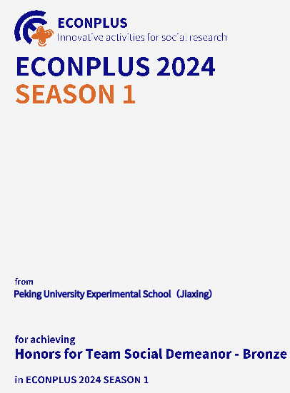 The award won by EconPlus 2024 in Economics Social Innovation Research has deepened my understanding of economic theory and made me realize its application value in practical social problems. At the same time, this award is an affirmation of my efforts and an encouragement for my future academic exploration. EconPlus 2024在经济学社会创新研究中获得的奖项加深了我对经济学理论的理解,让我意识到经济学理论在实际社会问题中的应用价值。同时,这个奖项也是对我努力的肯定和对我未来学术探索的鼓励。