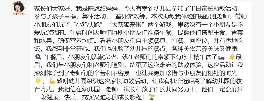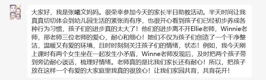 经过此次助教活动,家长看到孩子们的探索精神、童真童趣的氛围、幸福的笑脸、满满的自信......感受着孩子们在老师的呵护和照顾下的悄然蜕变,在爱的哺育下健康、快乐地成长。